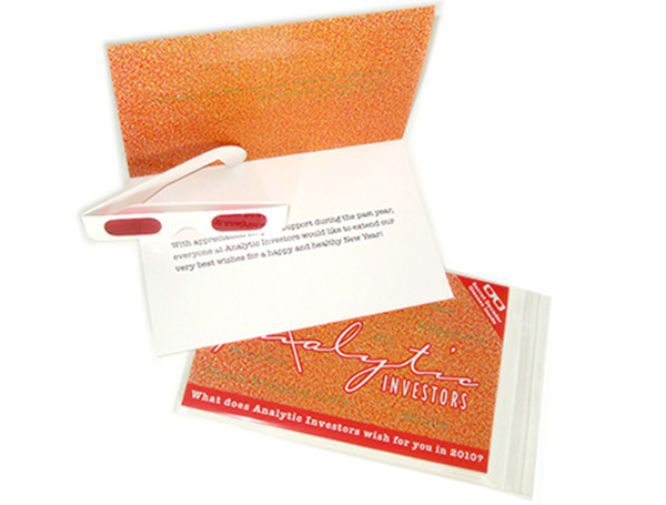 Included secret message red-filter glasses, clear cello envelope. Provided fufillment & mailing.